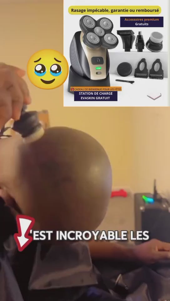 Comprend un rasoir rotatif, une tondeuse de précision, une tondeuse nez et oreilles, une brosse exfoliante et une éponge en silicone — tout ce dont vous avez besoin pour une routine de soin complète.